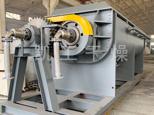 空心軸上密集排列著楔型中空漿葉,熱介質經空心軸流經漿葉。單位有效容積內傳熱面積很大,熱介質溫度從-40℃到320℃,可以是水蒸汽,也可以是液體型:如熱水、導熱油等。間接傳導加熱,沒有攜帶空氣帶走熱量,熱量均用來加熱物料。熱量損失僅為通過器體保溫層向環境的散熱。楔型漿葉傳熱面具有自清潔功能。物料顆粒與楔型面的相對運動產生洗刷作用,能夠洗刷掉楔型面上附著物料,使運轉中一直保持著清潔的傳熱面。漿葉干燥機的殼體為Ω型,殼體內一般安排二到四根空心攪拌軸。殼體有密封端蓋與上蓋,防止物料粉塵外泄而充分發揮作用。